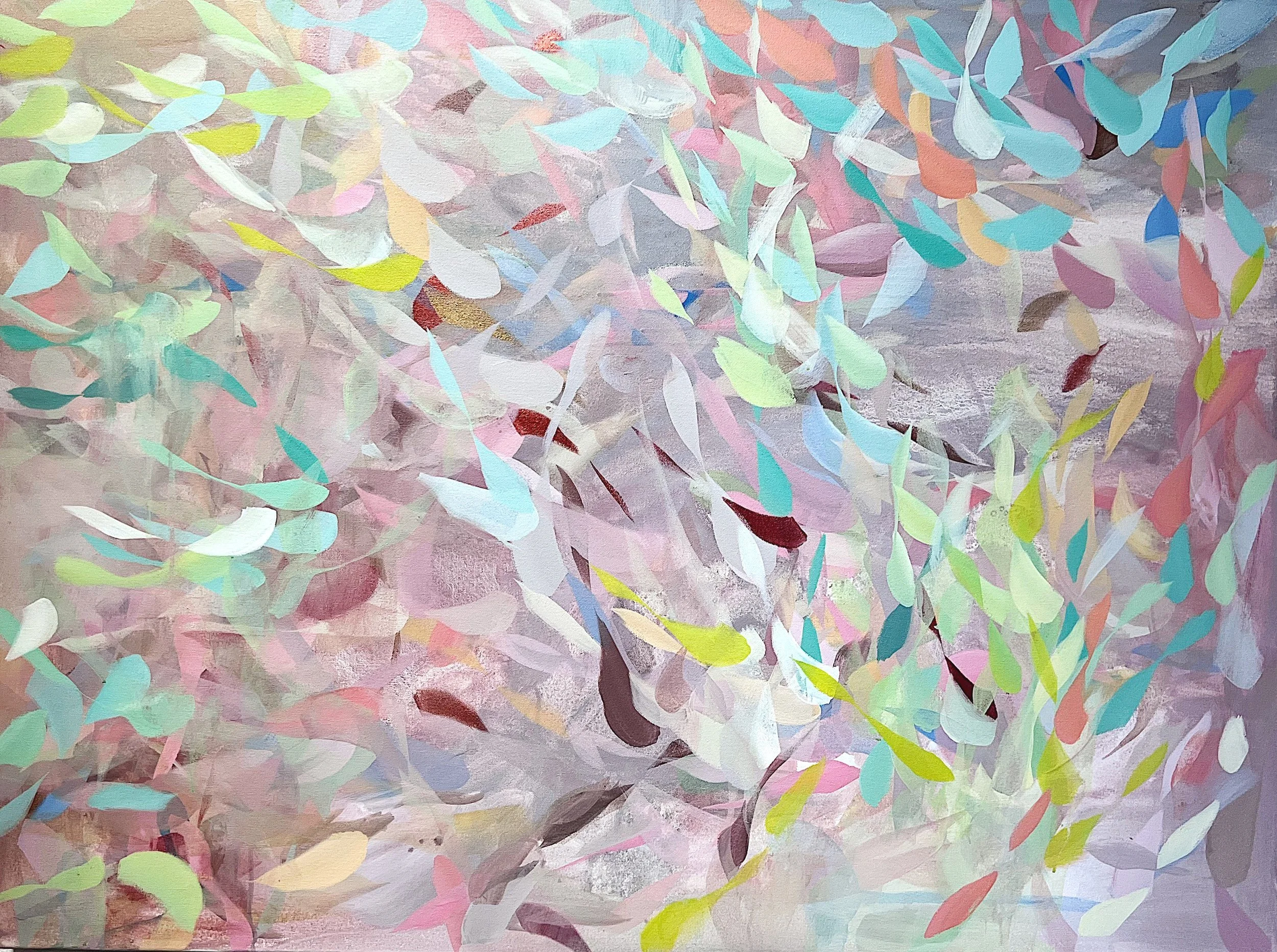 Then, several layers of paint are applied in a unique way. The artist works on the floor primarily and adds brushstrokes in a circular way to mimic the movement of falling leaves, swirling breezes or rippling water.